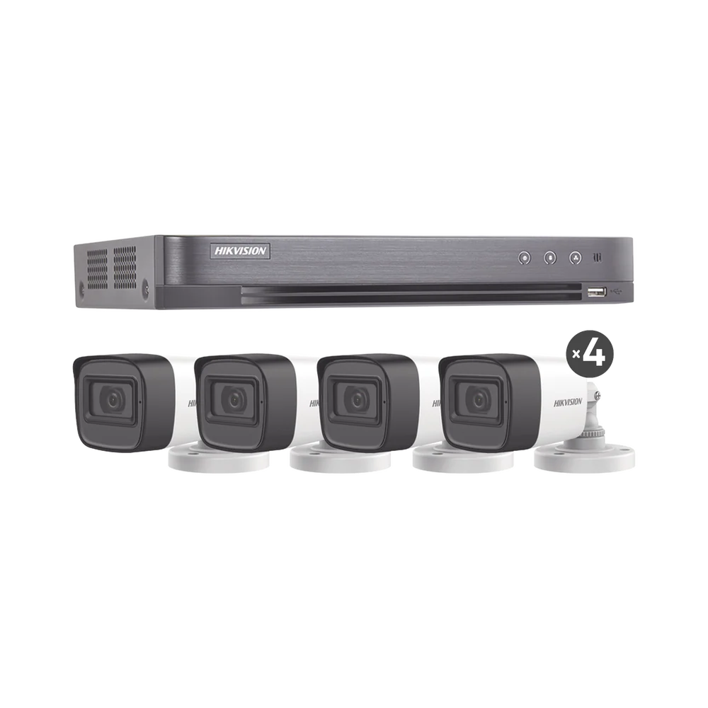 KIT de 4 cámaras HIKVISION TURBOHD 5 Megapíxeles / DVR 4 Canales / 4 Cámaras Bala con Micrófono Integrado (exterior 2.8 mm) / Fuente de Poder / Accesorios de Instalación