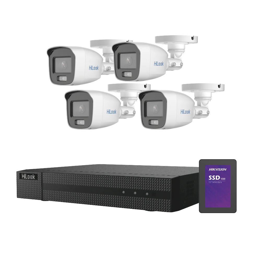 Kit TurboHD HILOOK 1080p + SSD 500 GB / DVR 4 Canales / 4 Cámaras Bala ColorVu con Micrófono Integrado / Fuente de Poder / Accesorios de Instalación – HL-1080-CV/A/512GB – HL-1080-CV/A/512GB