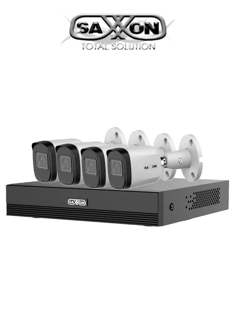 Kit de 4 Camaras SAXXON HDCVI 1080P 4 Cámaras B20M de 2.8mm con Campo de Visión de Hasta 100° Grabador Soporta Hasta 5 Canales IP y Detección de Movimiento Inteligente Cámaras Fabricadas en Metal de Alta Calidad- SUA-KIT/XVR1E04-I/4-B20M-0280B